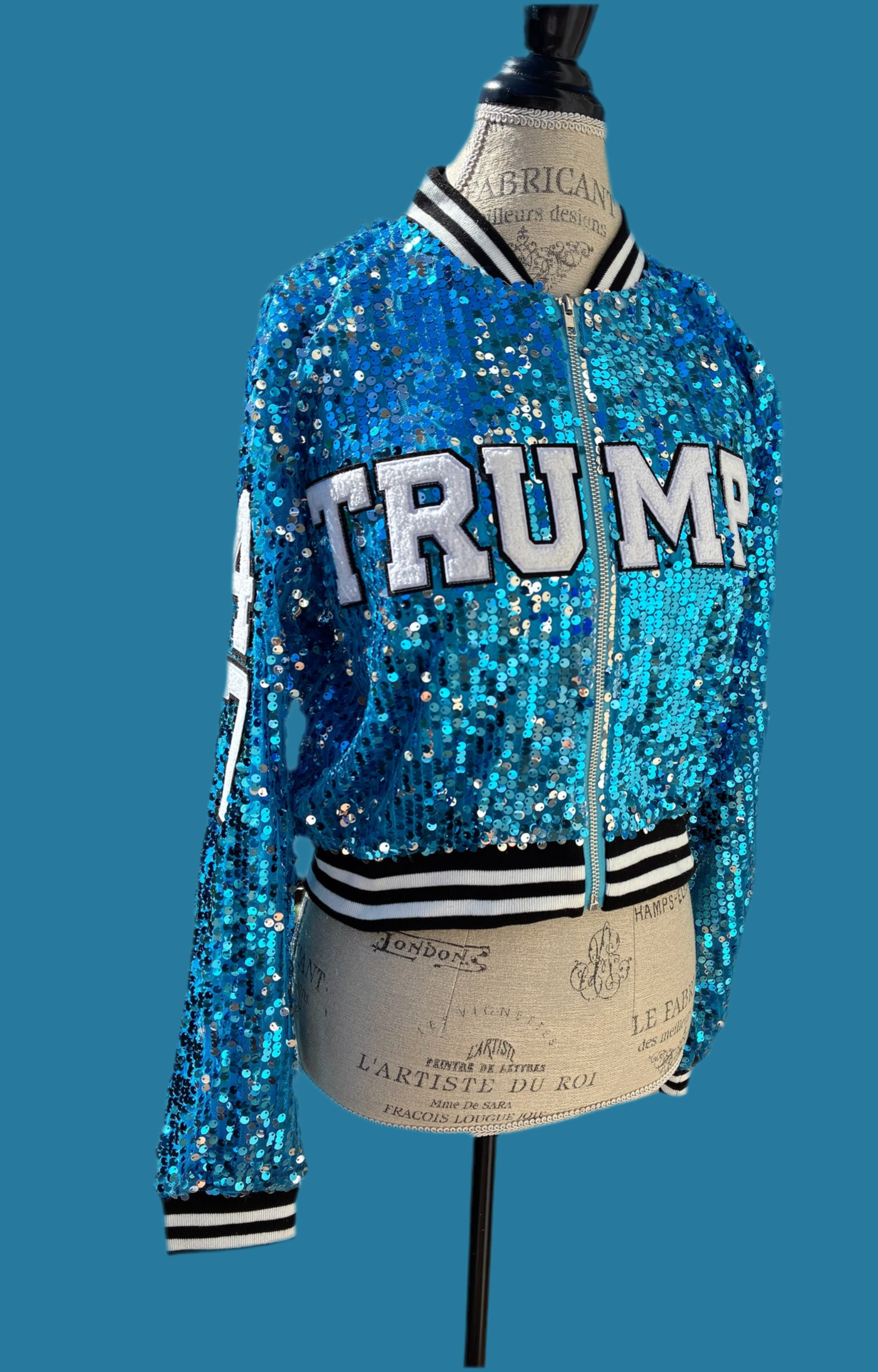 This is a CROPPED version of our custom sequin jackets. Glam up your look and display your loyalty with this chic "TRUMP MAGA” sequin jacket! Dazzle in light aqua blue sequins on a stylish jacket adorned with striking patches, including white “TRUMP” on the front, bold "MAGA” in white on the back and white “47” with a US EAGLE flag on the sleeve. Embrace your bold and classy side and show your support!"