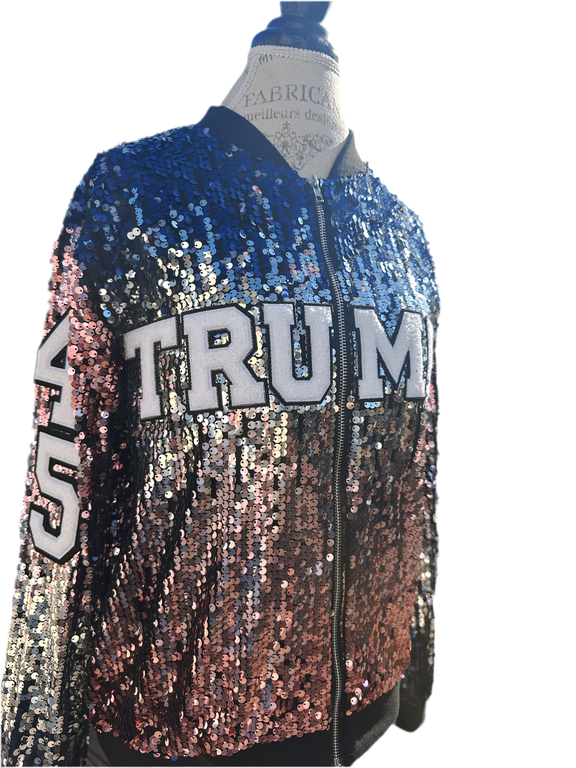 Excuse sophistication and show your support with this classy "TRUMP" & “ULTRA MAGA GIRL” sequin jacket! Featuring silver/black sequins on a black jacket with bold patches including “45” & “47” on the sleeves, “TRUMP"on the front and “ULTRA MAGA GIRL” on the back. Be bold, be classy, and join the nation!