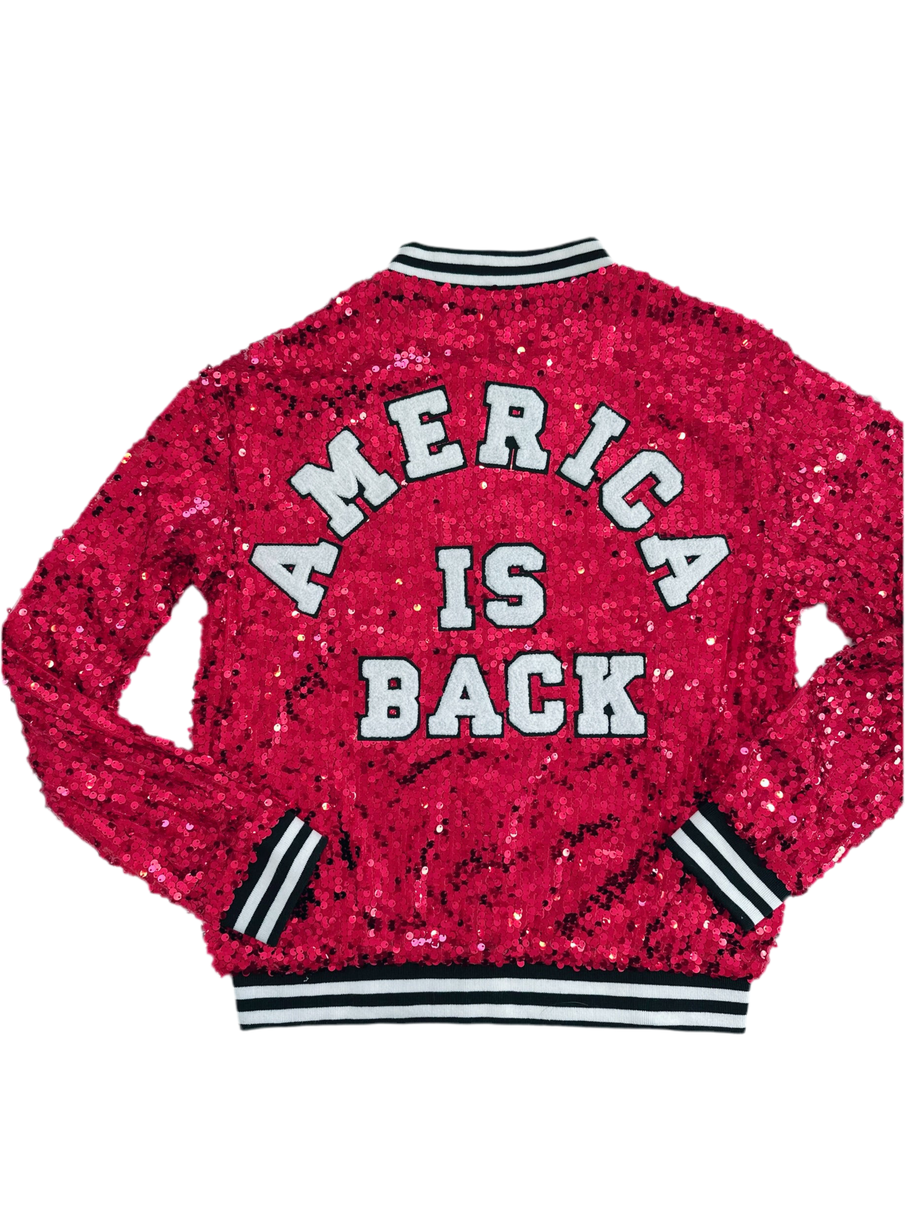 Exude sophistication and show your support with this classy "MAGA” sequin jacket! Featuring red sequins on a jacket with bold patches including white “MAGA” on the front, US flag on the sleeve and white ”AMERICA IS BACK” on the back. Be bold, be classy, and join the nation!