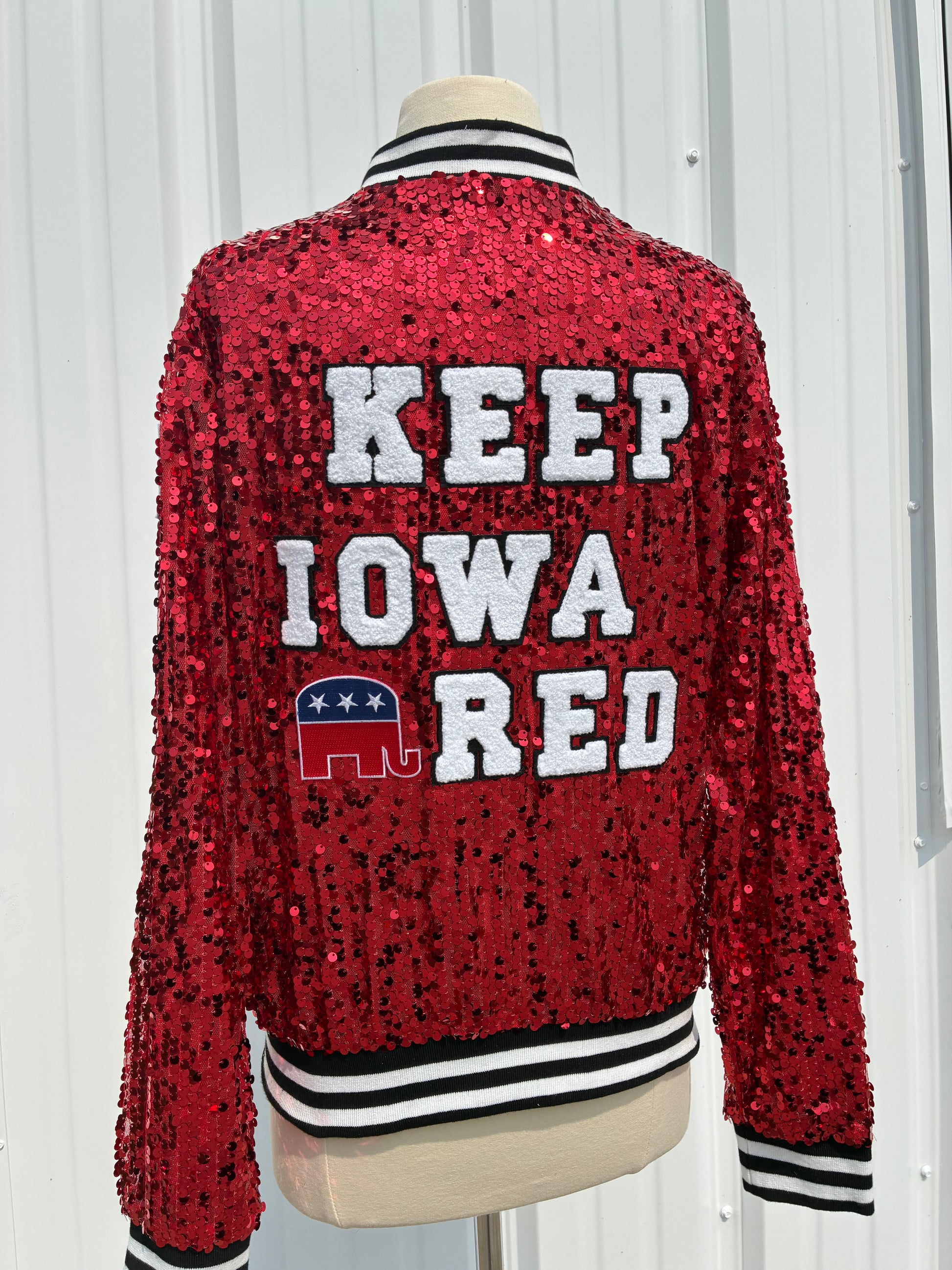 Exude sophistication and show your support with this classy sequin jacket! Featuring red sequins on a jacket with bold patches including white “Keep Iowa Red” on the front, US flag on the sleeve.